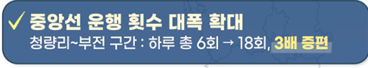 중앙선은 이번 개편의 핵심 노선으로, 운행 횟수가 3배 수준으로 증가합니다.
