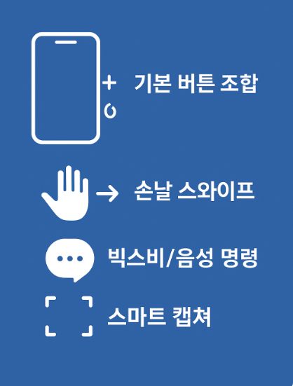 버튼 조합, 제스처, 음성 명령, 스마트 캡쳐 등 다양하게 제공됩니다.